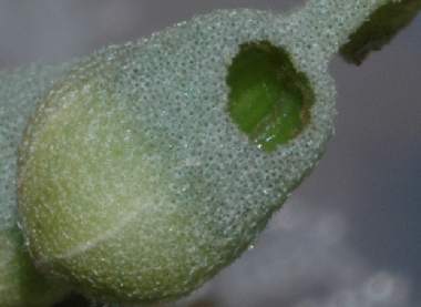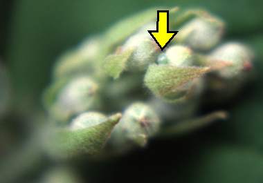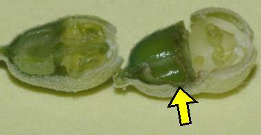 2006年5月18日 大阪府豊中市産 大阪市淀川区飼育 下の写真の左側は正常な蕾、右は食べられた後の蕾の半割りです。黄色矢印が頭を突っ込んでいた穴です。幼虫はいつも頭を蕾につっこんでいますが、蕾の中の隅々まで口が届いていたとは思いませんでした。結構長く伸びる頭を持っているようです。なお、上と中の写真の蕾は同じものですが、下の写真は、別の蕾です。中の写真の蕾は、撮影している間に幼虫が離れたため、少し中身が残っていました。 トップページへ |
