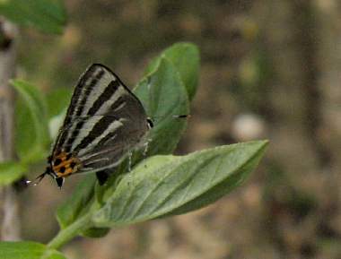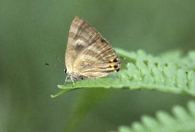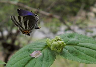 | トラフシジミは、裏面に縞模様があるために、虎斑と呼ばれるようです。春型と夏型があり、早春から出る春型の裏面は特にきれいだと思います。郊外の里山的環境では比較的多く見られます。大阪市近郊ではほとんど記録はありませんが、確実に生息はしているようです。大阪市では城東区と南港で記録があります。大阪市城東区では、フジ棚に飛来したり、夏型がフウセントウワタで吸蜜する記録があります(手塚浩、大昆・のせ、33巻、6号、通p.2478(2004))。尼崎市では長澤氏よりメールをもらいました(2006年4月30日小田南公園、目撃)。私自身は2006年5月に、大阪府豊中市で初めて、ウツギの蕾に若齢幼虫を見つけることができました。 |