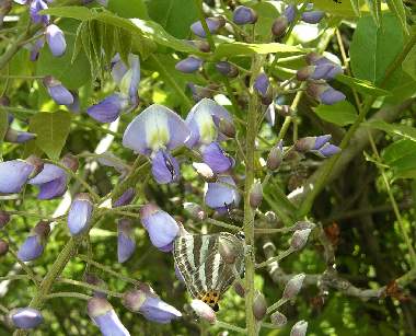 (参考) 産卵直前の成虫(春型、フジの花)とトラフシジミの卵、その環境 2006年5月4日 岡山県瀬戸内市邑久町 標高170m程度の低山の脇に藤が茂り、ちょうど見頃になっています。そこに、クマバチなどの花蜂と共にトラフシジミが集まってきて、産卵しました。卵は、一見ツルツルの青いまんじゅうに見えるのですが、拡大して見ると細かい模様が見えます。 トップページへ |