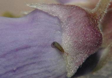 (参考) 食べながらピンクの糞をする幼虫(1齢) 2006年5月9日 岡山県瀬戸内市邑久町産 大阪市淀川区飼育 夜見ると、フジの蕾に食いつき穴を開けてみます。よく見るとピンクの糞の列があります。このあと、冷蔵庫に保存したフジの花はほとんど食べず、盆栽として売られていたヒメウツギの蕾も少し食べましたが、結局死亡しました。 トップページへ |