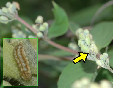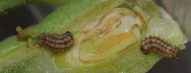 摂食中の幼虫(3齢、6mm)と中身の無くなったウツギの蕾の半割り