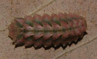 2006年5月24日 上: 07:52am 左が頭 下: 22:20 右が頭 大阪府豊中市産 大阪市淀川区飼育 蛹化が近づいて色に変化がありました。枯葉の上を歩いても見つかりにくい色になっています。 トップページへ |