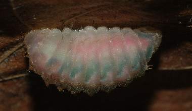 2006年5月27日 大阪府豊中市産 大阪市淀川区飼育 5月26日の夜には蛹化していました。これはその翌日の撮影です。なお、トラフシジミの蛹の鳴き声をアップします(wav形式、120kb)。6月6日に録音したもので、この写真の個体よりも後から蛹化したものです。以前、ミズイロオナガシジミの蛹の鳴き声をアップしましたが、こちらはより大きく録れています。どういう仕組みで鳴くのかはまだ知りません。警戒音であることは間違いないでしょう。 トップページへ |