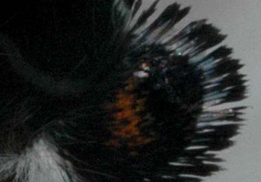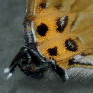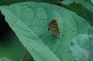 2009年7月25日 静岡市駿河区大谷 少し遠いですが、後翅尾状突起周辺の様子をアップにしてみました。このページの下方に述べているように、いわゆる偽頭(偽眼)が最も発達しているシジミチョウでしょう。 トップページへ |