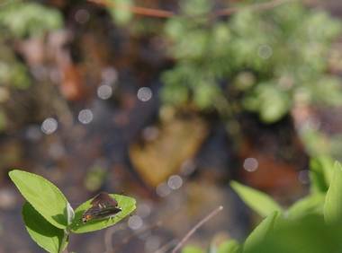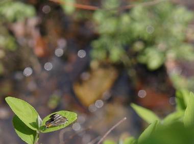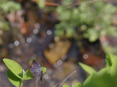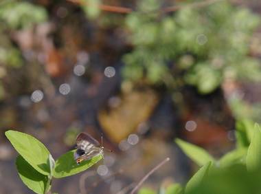 (参考) トラフシジミの飛び立ち 2008年4月30日 兵庫県宝塚市武田尾 EX-F1、接写レンズNo.1、パスト連写(60fps、0.5s)、ISO200、F3.8、1/1250s 川の道路面に食樹のウツギが生えていて、産卵に来ていたのですが、産卵はしなかったようで蕾の当たりをゆっくり歩いたあと時々葉上で静止していました。その後飛び立ったときの様子です。翅の角度で色合いが大きく変わります。 トップページへ |