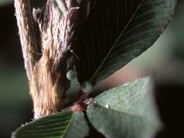 産卵、卵、環境(ハギ) 2004年10月3日 大阪府豊中市服部緑地公園 樹高1.5mぐらいのハギの枝先の新芽の元に尾端を突き刺すようにしてに卵を産み付けていました。 トップページへ |