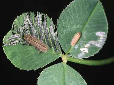 幼虫(3齢、2齢) 2002年10月26日 大阪市淀川区西中島産♀強制産卵 淀川区飼育 結局ヤハズソウではうまく育たずすべてシロツメクサに移しました。葉の表皮を残して食べます。色はこのような褐色のものと緑のものがいました。 トップページへ |