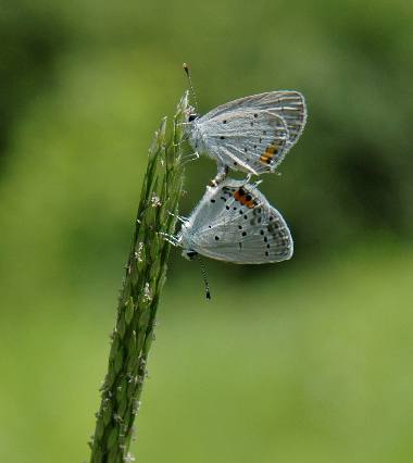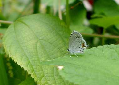 2011年7月25日 大阪府豊中市服部緑地公園 夏型(おそらく第3化)の出始めのようで、新鮮な雌雄のツバメシジミが多く見られました。翅の縁に毛が残っており、羽化後まもないと思われます。触角を下げて、蜜のありかを捜しているのでしょうか。しかし口吻は伸ばしていません。 トップページへ |