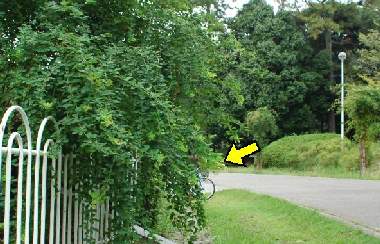 産卵位置(メドハギ) 2003年5月2日 大阪府摂津市一津屋 淀川の右岸の河辺に生えているマメ科植物です。メドハギと思われます。上の写真のものとは別の場所です。矢印の位置に卵があります。 トップページへ |