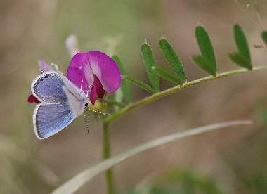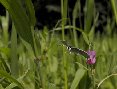 吸蜜後のツバメシジミの飛び立ち(♀、カラスノエンドウ)