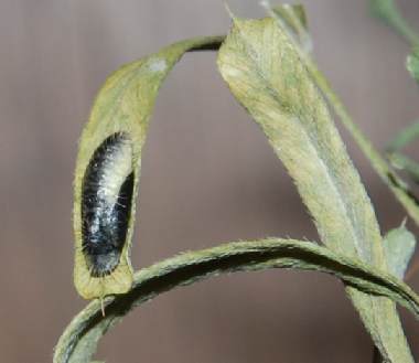 蛹 2002年11月10日 大阪市淀川区西中島産♀強制産卵 淀川区飼育 逃げ出したものも多いのですが、このように、葉裏で蛹化したものもいました。結構毛深い。 トップページへ |