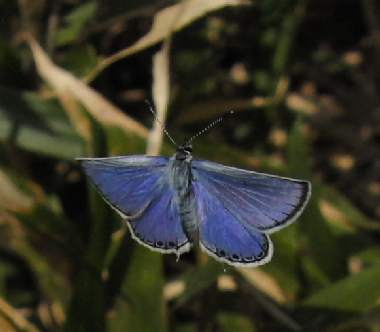 休息 2006年9月9日 大阪府豊中市服部緑地公園 暑い日でしたが、林床をちらちらと♀を探して飛ぶ♂がいてときおり、イネ科やマメ科の葉の上で休んでいました。逆光に透ける翅裏と青い表を同時に写してみました。 トップページへ |