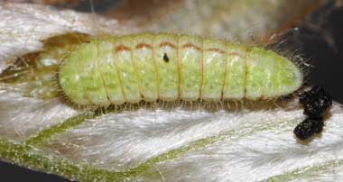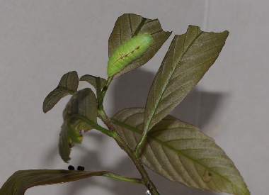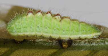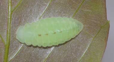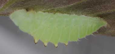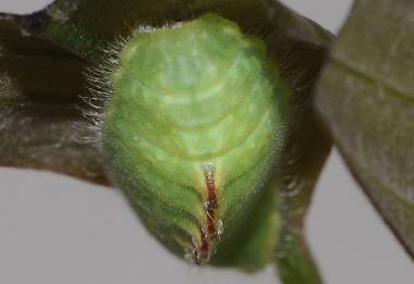 脱皮後間もない幼虫(4齢、10.0mm、アラカシ) 2015年4月6日 撮影 茨城県牛久市 産 静岡市駿河区 飼育 個体1:簡単な巣の中で脱皮して終齢(4齢)になりました。背中のこぶが大きくなったようです。 トップページへ