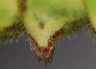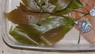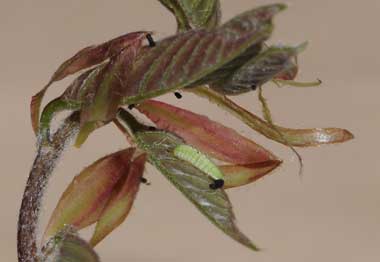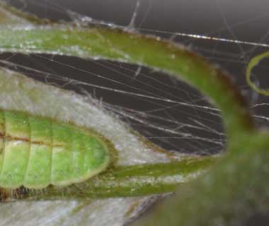 脱皮後成長したウラナミアカシジミの幼虫(3齢、10.0mm、アラカシ)と巣 2015年4月5日 撮影 茨城県牛久市 産 静岡市駿河区 飼育 個体1:3齢になると葉柄に噛み傷をつけしおらせて、さらに糸で結び付けて簡単な巣を作るようです。 トップページへ