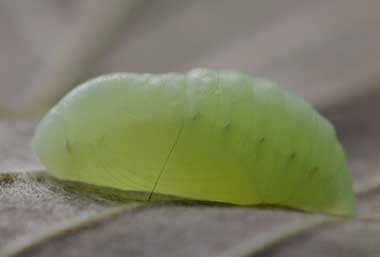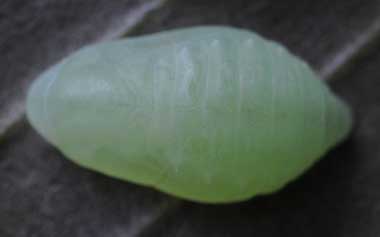 ウラナミアカシジミの蛹(13.0mm) 2015年4月18日 撮影 茨城県牛久市 産 静岡市駿河区 飼育 個体1:4月16日に蛹化しました。前蛹期間3日でした。透明感のある薄緑色で大変きれいです。少し逆光気味に自然光で撮ってみました。 トップページへ