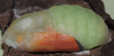 羽化前兆を示すウラナミアカシジミの蛹(13.0mm) 2015年4月27、28日 撮影 茨城県牛久市 産 静岡市駿河区 飼育 個体1:まず翅が濃いオレンジになり、その後腹部がすこしオレンジ色になりました。その後、濁った感じになり、いよいよ羽化しそうです。しかしここで出勤です。 トップページへ