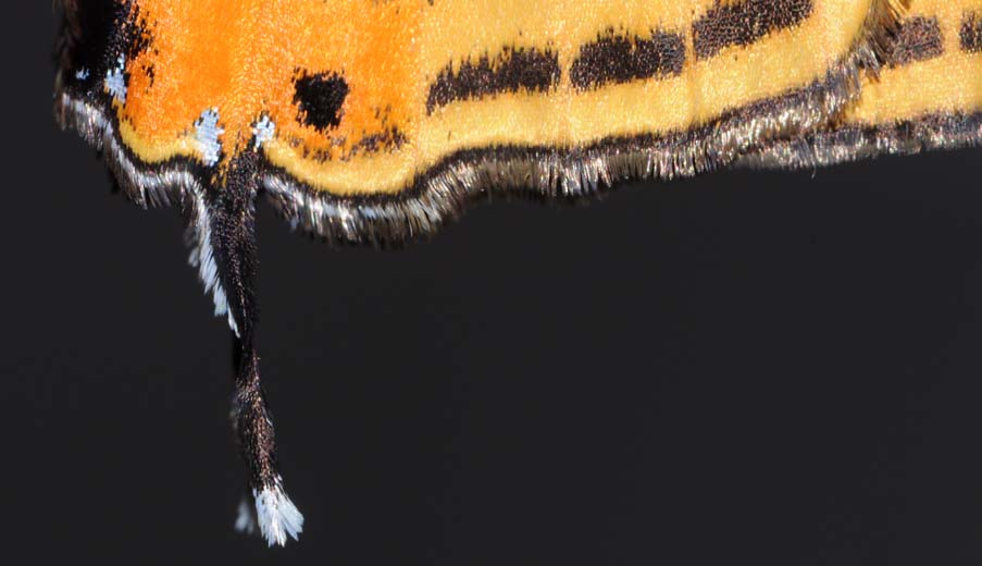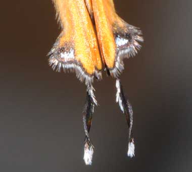 羽化後まもないウラナミアカシジミ(♂) 2015年4月29日 撮影 茨城県牛久市 産 静岡市駿河区 飼育 個体2:2匹目も翌日羽化しました。蛹化したのは1日後ではなかったので、♂だから蛹期が短かった可能性があります。♀は、前翅表面角部が黒くなりますが、♂では黒い縁取りがあるだけです。尾状突起のあるあたりは頭部を模擬した偽頭あるいは偽眼模様と言われています。上から見ると、一瞬、左側が本当の頭のように思えます。さらにいわゆるすりすり行動で、後翅をゆっくり動かします。おそらく、捕食者である鳥やトカゲなどにもそのように見えるので、攻撃から生き延びる確率が上がるのでしょう。 トップページへ |