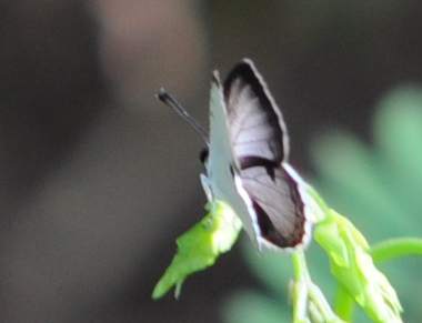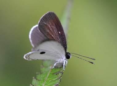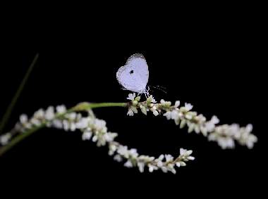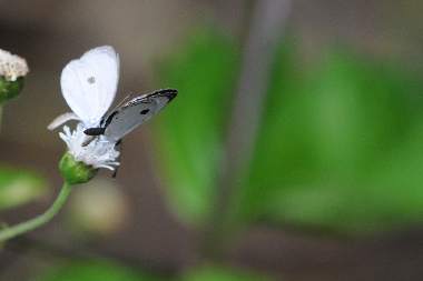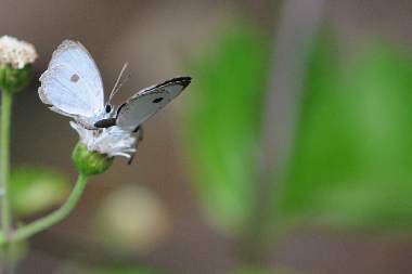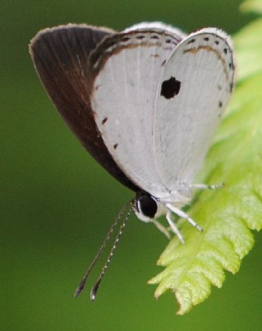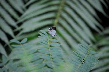 | リュウキュウウラボシシジミは、日本では、沖縄本島北部と西表島だけ(石垣島の記録あり)に生息するとてもかわいい蝶です。夏型♂は、日本土着種としては最も小さい蝶と言われています。最近では、ホリイコシジミとタイワンヒメシジミが定着しているので最小ではなくなるかもしれませんが、大きさは同じぐらいと思います。裏面に目立つ黒い紋があり、また木漏れ日の中で飛ぶ姿は、裏面の白と表面の黒が交互になってチラチラ感が強く、とても魅力的な蝶です。私は、沖縄本島、西表島2回の3度の撮影行でいずれも撮影できず、非常に憧れの強い蝶でしたが、意を決して2011年11月にこの蝶だけを目標とした3泊の西表行を敢行してついに思いを遂げることができました。このときは様々な生態を見せてくれました。また、人工採卵の卵を入手して、インゲンで飼育しています。 |