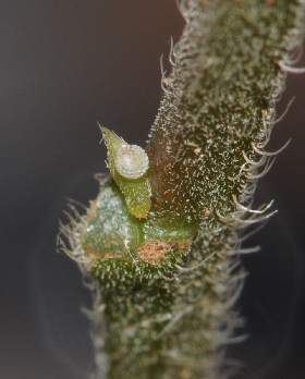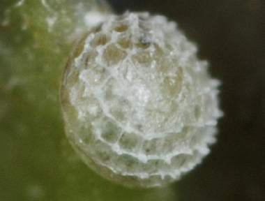 (参考) 孵化間近のリュウキュウウラボシシジミの卵(0.7mmφ)と採卵に使われたトキワヤブハギ 2014年4月4日 撮影 沖縄県西表島産母蝶から採卵 by H氏 静岡市駿河区 飼育 数卵の卵を入手しました。1卵のみ孵化しておらず撮影したのですが、この2時間後には孵化しました。卵は新芽や葉表に産まれていました。 トップページへ |