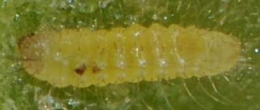 (参考) 幼虫(1齢、1.9mm、インゲン) 2014年4月6日 撮影 沖縄県西表島 産 静岡市駿河区 飼育 個体2:残念ながら、個体1は眠に入ったようだったのですが、そのまま死んでしまいました。これは別の個体です。こちらは個体1に比べて成長が遅かったのですが、成長しています。腹部に黒点があり、これは最初に移動したときに傷を付けたためと思っています。 トップページへ |