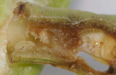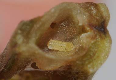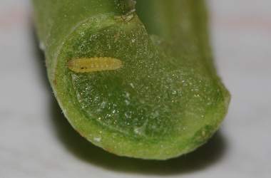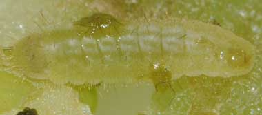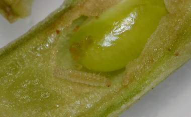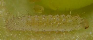 (参考) 眠に入った幼虫(1齢、インゲン) 2014年4月9日 撮影 沖縄県西表島 産 静岡市駿河区 飼育 個体2:インゲンの本来豆のあった空洞で静止しています。脱皮のため眠に入ったようです。 トップページへ |