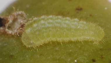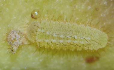 (参考) 幼虫(1齢、インゲン) 2014年4月5、6日 撮影 沖縄県西表島 産 静岡市駿河区 飼育 個体1:若いインゲンで飼い始めました。何とか食べて大きくなっていますが、気に入っているのではないようで、食べるところを変えています。豆そのものを食べることはほとんど無いようです。インゲンが気に入らないためか、共食いして1匹犠牲になりました。 トップページへ |