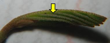 (参考) 卵と産卵位置(個体3) 2008年秋 近畿地方 他の例です。新芽の基部に1卵産まれていました。 トップページへ |