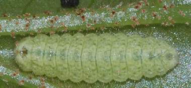 (参考) 成長したウラクロシジミの幼虫(1齢、2.3mm) 2009年4月6日 近畿地方 産 静岡市 飼育 体長が2倍くらいになりました。左が頭です。 トップページへ |