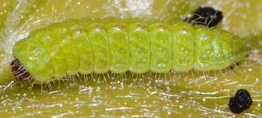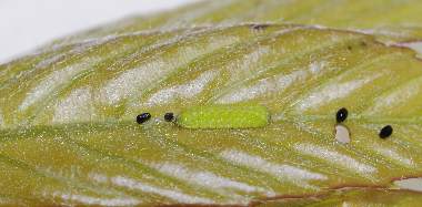 (参考) 孵化後間もないウスイロオナガシジミの幼虫(1齢、1.5mm、アラカシ) 2014年3月21日 撮影 北海道奥尻郡 母蝶採集、人工採卵 by T氏 静岡市駿河区 飼育 個体1:3月16日に冷蔵庫から卵を出し、部屋の中においていたところ、今日孵化しました。さっそくアラカシの少し伸びた芽を剥いて付けたところ食いついたようです。 トップページへ |