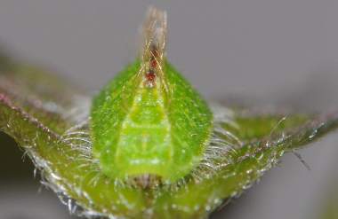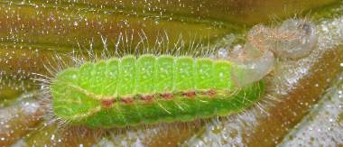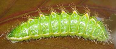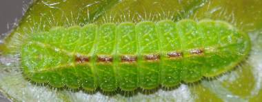 (参考) 脱皮後成長した幼虫(3齢、9.2mm、アラカシ) 2014年4月3日 撮影 北海道奥尻郡 産 静岡市駿河区 飼育 個体2:3齢になって、ますます背中の赤い模様と毛が目立つようになりました。角張った感じのする幼虫です。 トップページへ |