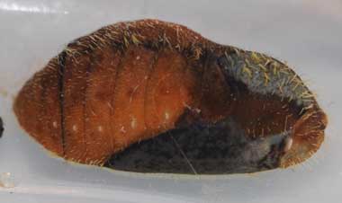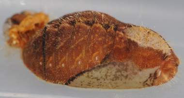 (参考) 羽化1日前のウスイロオナガシジミの蛹(11.8mm) 2014年4月27日 撮影 北海道奥尻郡 産 静岡県駿河区 飼育 個体2:蛹化後およそ14日で、翅の部分がようやく黒く色づいてきました。 トップページへ |