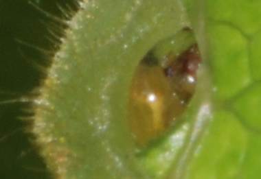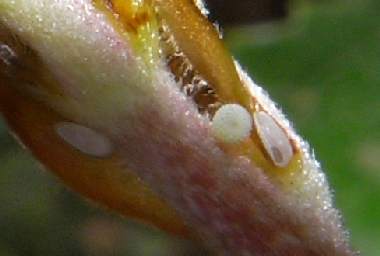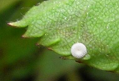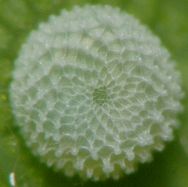 (参考) 卵(ノイバラ) 2008年11月8日 大阪府泉南郡岬町 上に示したものではなく、おそらくごく最近産まれたまだ青みがかった卵です。このページ下方にこの卵から孵化した幼虫の飼育の様子を示します。 トップページへ |
