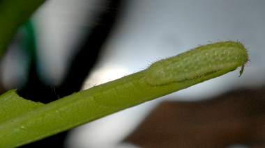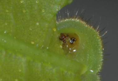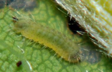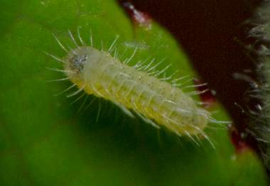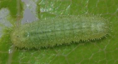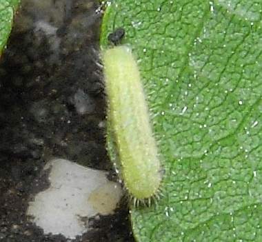(参考) 少し成長した幼虫(1齢、1.5mm) 2008年11月14日 大阪府泉南郡岬町 産 大阪市淀川区 飼育 少し成長しました。表皮を残しながらノイバラの葉裏を食べています。 トップページへ |