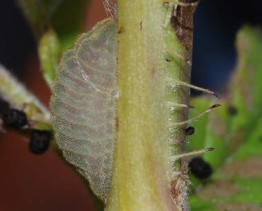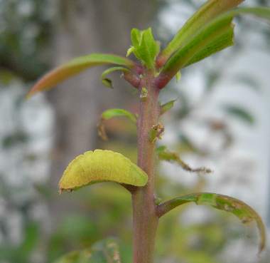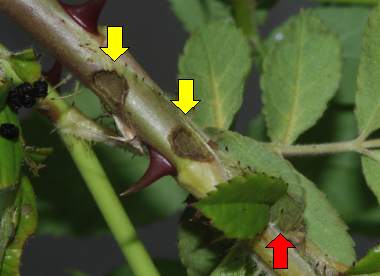 ![]() ↑ノイバラの軸の囓られた跡と囓っている終齢幼虫 2008年11月18日 ![]() ↑拡大 ![]() ↑前蛹 11月19日 ![]() ↑蛹 11月21日 |