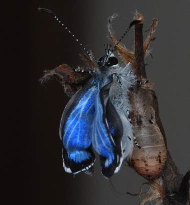 (参考) 羽化の瞬間 2008年12月4日 大阪府泉南郡岬町 産 大阪市淀川区 飼育 部屋の中に置いておいたところ、約2週間で羽化しました。いつ見ても、シジミの羽化はかわいいです。 連続写真はこちらのPDFファイルを見て下さい。pdfリーダーの環境設定で、ページ表示を単一表示に設定しておくと見やすいです。 トリミングしているので、一部欠けています。羽化直前になるといったん翅の模様がぼやけてきます。シジミの場合そのときに明かりを付けると大体15〜30分ぐらいで羽化します。カメラのファインダーで覗いていたところ、胸のあたりがビクビクとふくらみ、その後すぐに羽化が始まりました。 トップページへ |