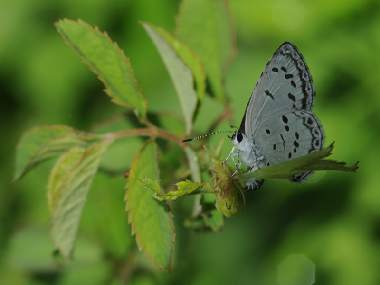 | ヤクシマルリシジミは大阪市周辺ではまだ見られません。その名前や翅の輝きから南国の蝶のイメージですが、少なくとも30年前の図鑑類にも、その当時の北限の和歌山県や三重県では多いと書かれていて、耐寒性もかなりあると思われます。それがやはりこのところの温暖化の影響でか、1989年に大阪府での発生が確認されて以来、大阪府南部でもごく普通に観察されるようになりました。晩秋においても小春日和の日には多くの成虫が飛ぶのが見られるそうです。私はまだ大阪府では成虫を見たことがありません。大阪府でも植生は非常に広く、大阪市周辺部にも多数あるノイバラ、栽培バラ、ヤマモモ、ウバメガシなどを食樹としています。ですから気候的にも植生的にも大阪市周辺に進出してもおかしくないと思われます。それを阻む何かがあるのでしょう。ここでは、大阪府の南端にあたる岬町での幼虫の生態やその飼育の様子を主に示します。 |