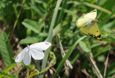 (参考) モンキチョウに求愛されるヒメシロチョウ(♀) 2016年7月30日 長野県 ヒメシロチョウを探していたこの日、やっとあえた瞬間です。ありがたいことに、モンキチョウがヒメシロチョウ♀を追い出してくれたようです。執拗に迫っていたので、帽子でモンキチョウを追い払いました。するとその後、吸蜜、産卵と、期待した行動に移ってくれました。 トップページへ |