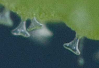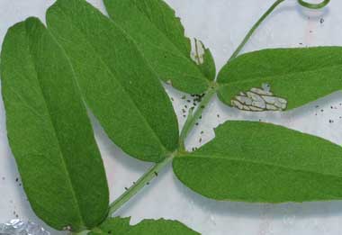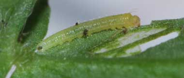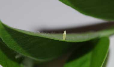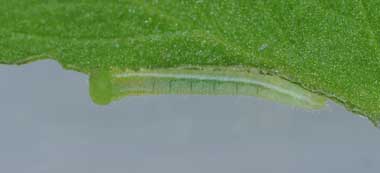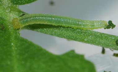 (参考) 孵化後少し成長したヒメシロチョウの幼虫と食痕(1齢、3.5mm、ツルフジバカマ) 2016年8月1日22:20 撮影 静岡市駿河区 飼育 長野県 産 葉脈を残す独特の食べ方ですが、モンキチョウの食痕にも似ています。 トップページへ |