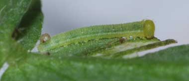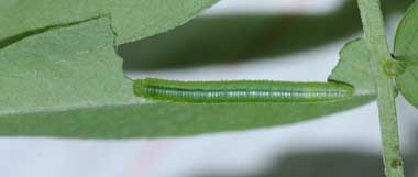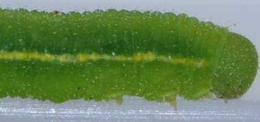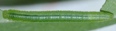 (参考) 脱皮後成長したヒメシロチョウの幼虫(4齢、19.6mm、ツルフジバカマ) 2016年8月16日 撮影 静岡市駿河区 飼育 長野県 産 個体2です。なぜか容器のふたに止まっていました。蛹化場所をここにしようとしているのか、餌が気に入らないのか判断に迷いましたが、外して葉の上に置いたところ、しばらく食べていました。ほっとしました。側線は黄色味を帯びていますが、黄色みが強い所と弱いところがあります。 トップページへ |