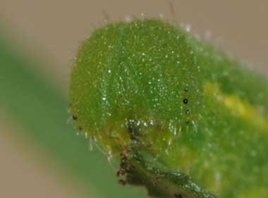 (参考) 脱皮前後のヒメシロチョウの幼虫(2→3齢、6.3→6.5mm、ツルフジバカマ) 2016年8月5、6日 撮影 静岡市駿河区 飼育 長野県 産 3齢に脱皮しました。頭部がきれいな薄緑色になり、側線も明瞭です。 トップページへ |