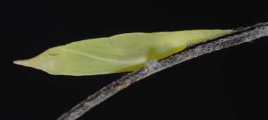 (参考) ヒメシロチョウの蛹(16.7mm) 2016年8月20日 撮影 静岡市駿河区 飼育 長野県 産 個体2です。突起の長い蛹ですが、ツマキチョウのように反り返ってはいません。旅行に行っていたため正確な蛹化日が分かりませんが、8月19日としておきます。幼虫を飼うのに使う冷室箱が壊れており、旅行から帰るとなんと36℃になっていました。大変心配しましたが、透明感のある蛹で、おそらく大丈夫だと思います。 トップページへ |