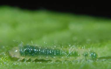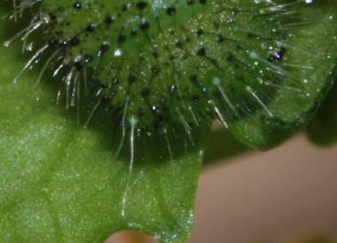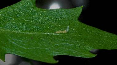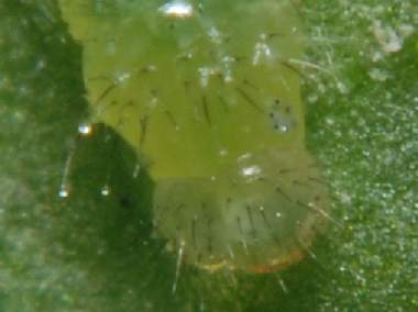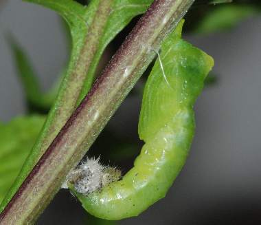(参考) 幼虫(1齢、3.2mm) 2008年5月5日 大阪府東大阪市生駒山系 産 大阪市淀川区 飼育 夜中に孵化して既に卵殻と葉を食べて緑になっています。 トップページへ |