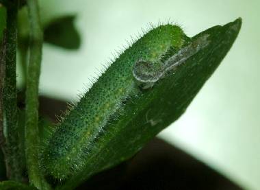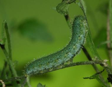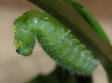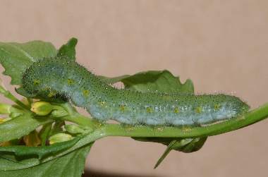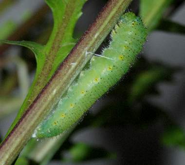 (参考) 幼虫(5齢(終齢)、29mm) 2008年5月14日 大阪府東大阪市生駒山系 産 大阪市淀川区 飼育 終齢になると、葉だけでなく蕾や茎まで食べ尽くします。頭部の少し長い毛は白です。 トップページへ |