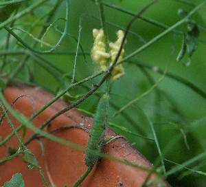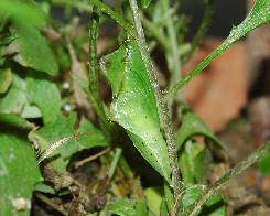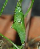 (参考) 前蛹 2004年5月17日 8:20 大阪府豊能町初谷産 大阪市淀川区飼育 食草の茎で前蛹になりました。昨日からこの位置にいましたが、昨日見たときは前蛹ではなかったように思います。 トップページへ |