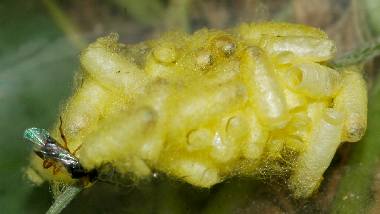 (参考) 寄生(アオムシコマユバチ) 2004年5月23日 大阪府豊能町初谷産 大阪市淀川区飼育 ベランダ下に置いてある鉢で飼っていた幼虫の成長が悪いように思っていましたが、アオムシコマユバチの幼虫が出てきて近くに繭を作りました。アオムシコマユバチはスジグロシロチョウにはあまり寄生しないそうなので、このチョウは、やはりエゾスジグロシロチョウの可能性が非常に高くなりました。 トップページへ |