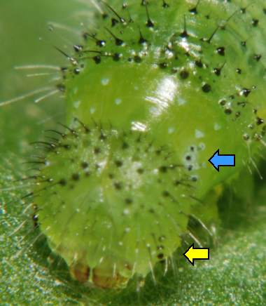 (参考) 幼虫の脱皮(4齢から5齢) 2008年5月10日 大阪府東大阪市生駒山系 産 大阪市淀川区 飼育 黄色矢印が4齢幼虫の単眼跡、青色矢印が5齢幼虫の単眼です。 トップページへ |