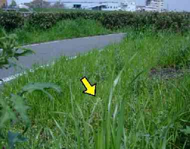 環境と産卵位置 2003年4月19日 大阪市東淀川区 神崎川左岸の河川敷です。秋にはススキが茂りイチモンジセセリの幼虫が観察できるところです。左側に見える垣根はアベリアです。矢印が食草のカキネガラシに産まれた卵の位置です。ツマキチョウは基本的につぼみまたはすぐ隣の小さな葉に生むようです。 トップページへ |