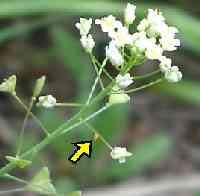 ツマキチョウの卵(カキネガラシ) 2003年4月19日 大阪市東淀川区 矢印の位置に卵があります。 トップページへ |