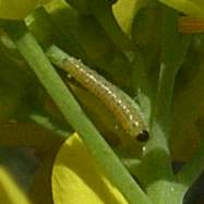 ツマキチョウの幼虫(1齢、上:セイヨウカラシナ、下:カキネガラシ) 2006年5月5日 大阪府豊中市 2006年は2005年に比べて大部季節の進み方が遅れています。2種のアブラナ科の花の中に、1齢幼虫を見つけました。上のセイヨウカラシナには卵も見*られます。 トップページへ |