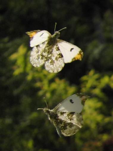 2009年4月18日 静岡市駿河区大谷 小川沿いの草地と畑が混じるところで、時折大好きなツマキチョウが飛び交いました。主にカラスノエンドウで吸蜜するのが見られたのですが、一所に固執する♂がいて、急いで駆けつけると求愛中でした。♀の周りを飛び時々♀に接触するぐらい近づくのですが、♀は、触角をそろえて前に伸ばし、尾部を上げて交尾拒否です。写真データを見ると3分ぐらいはそういう状況でした。残念ながら♀が飛んでいきましたが、♂は名残惜しく10秒ぐらいはその周りを飛んでいました。ISO感度を上げてシャッタースピードを上げればよかったと思います。 トップページへ |